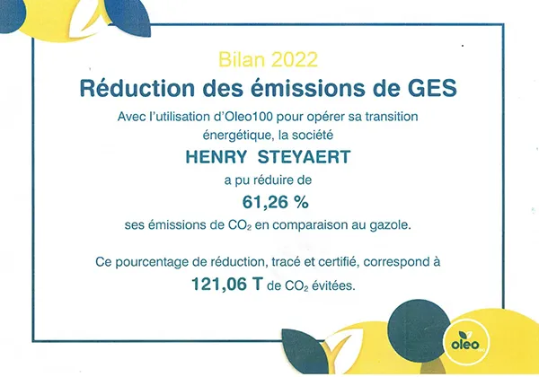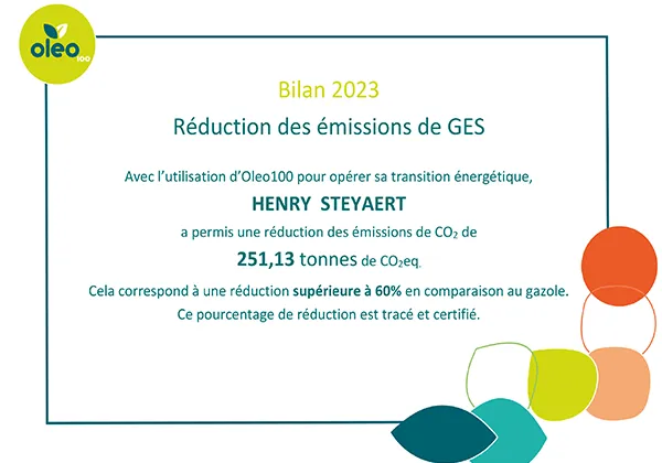 Nous offrons des solutions adaptées à la fois aux petites et grandes entreprises, avec un accent particulier sur l'éco-responsabilité. Notre engagement envers l'environnement est confirmé par nos initiatives de réduction des gaz à effet de serre. Nous avons d’ailleurs obtenu la certification Oleo 100 pour la réduction des gaz à effet de serre en 2022 et 2023, attestant de notre engagement à utiliser un biocarburant durable à base de colza, contribuant ainsi à une diminution significative de notre empreinte carbone.